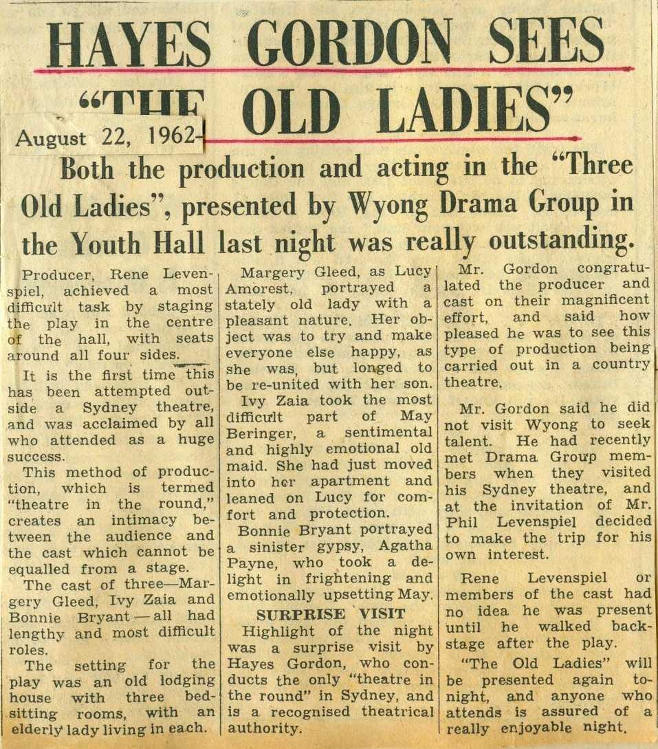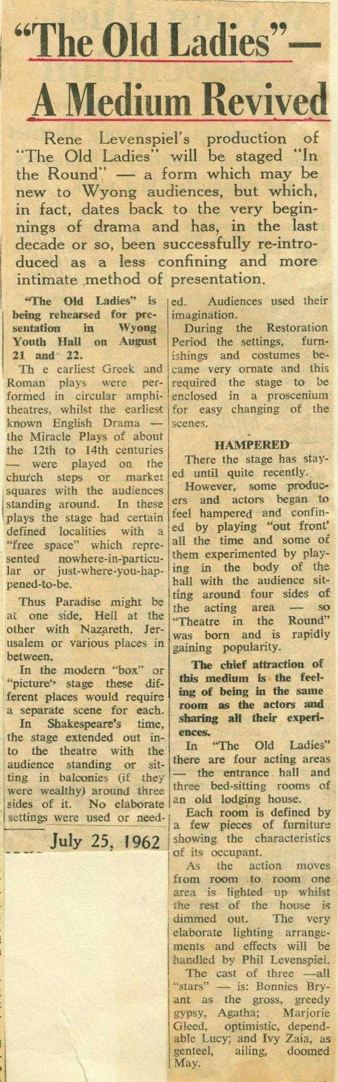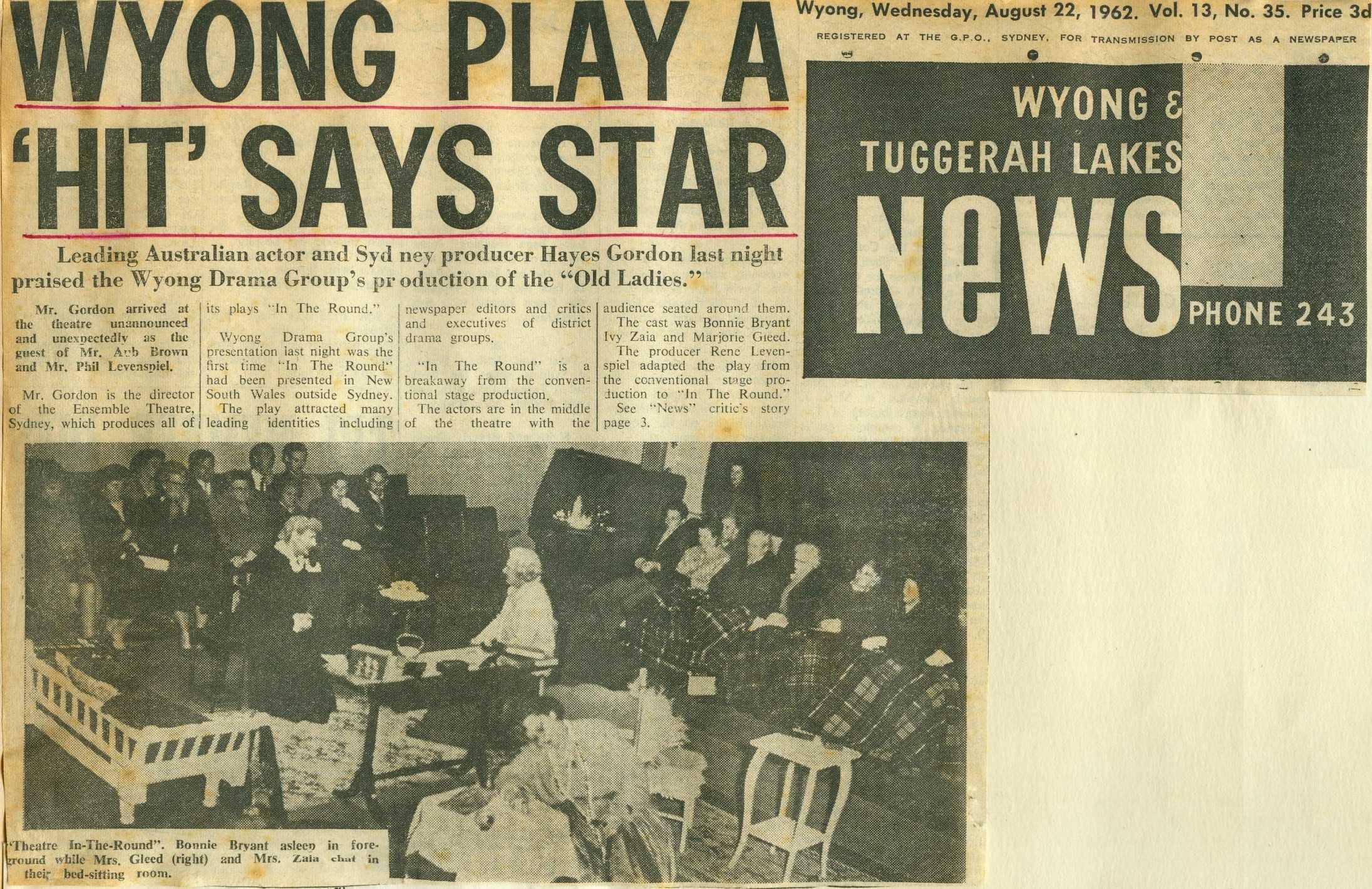 This was the first production done by WDG in the round, and was by all accounts a dramatic triumph for producer Rene Levenspiel. Rene also had a hand in making some adaptations to the script in order to achieve the setting in the round. The play was very well received, and a famous audience member, veteran Australian actor Hayes Gordon actually saw Wyong's presentation. It was presented on Tuesday 21 August and Wednesday 22 August 1962.