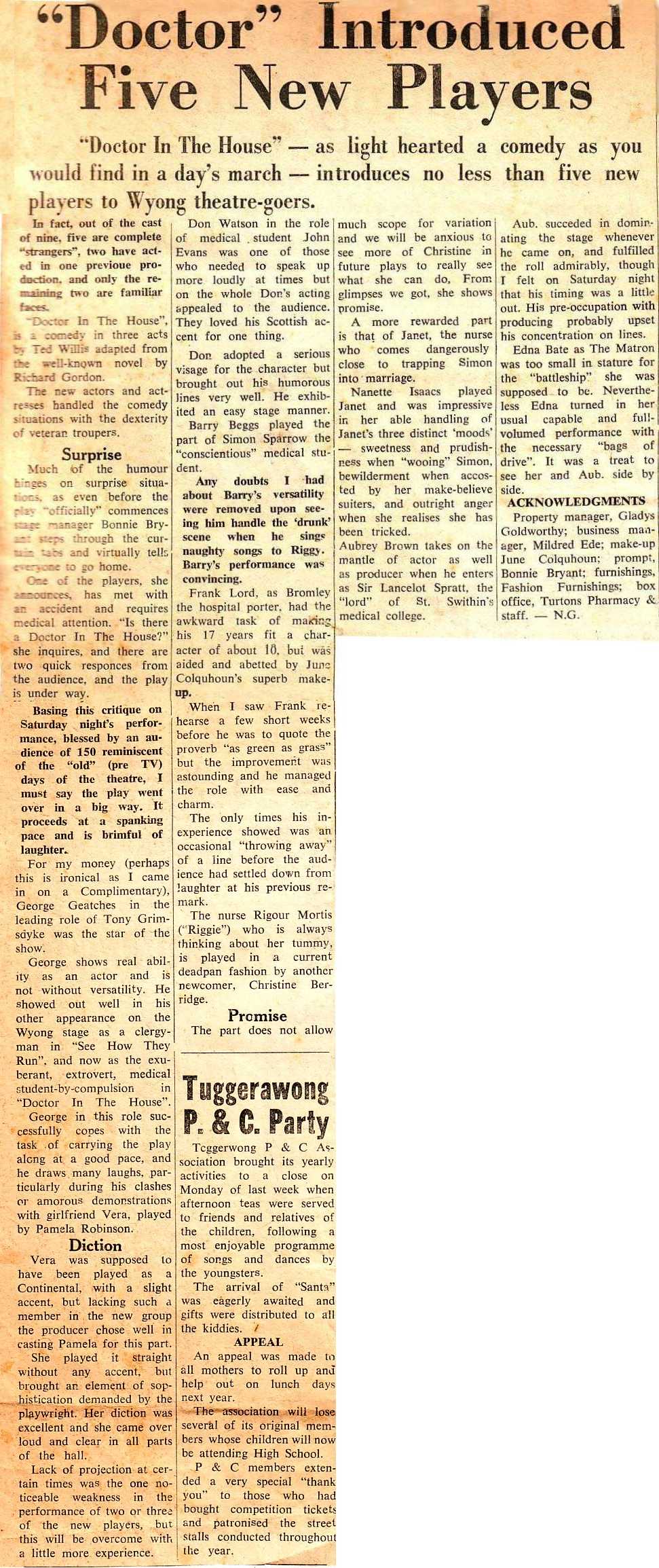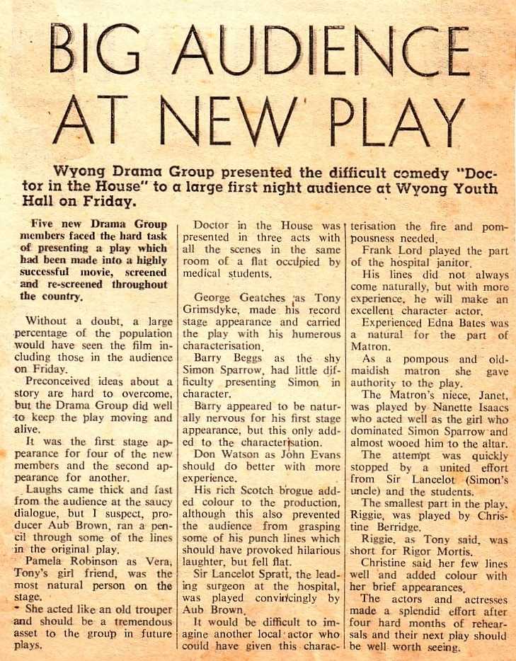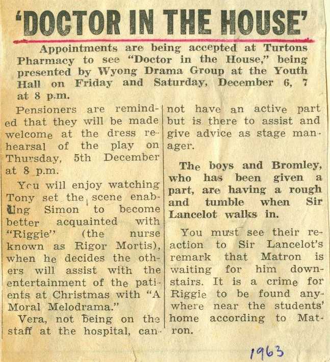 The popularity of this Richard Gordon novel, which was subsequently made into a film with Dirk Bogarde and James Robertson Justice, was too much for Wyong Drama Group to resist, and Aub Brown put up his hand to produce the play (December 1963). He also took on the role of Sir Lancelot Spratt. The play was produced on Friday 6 December and Saturday 7 December 1963 at the Youth Hall.