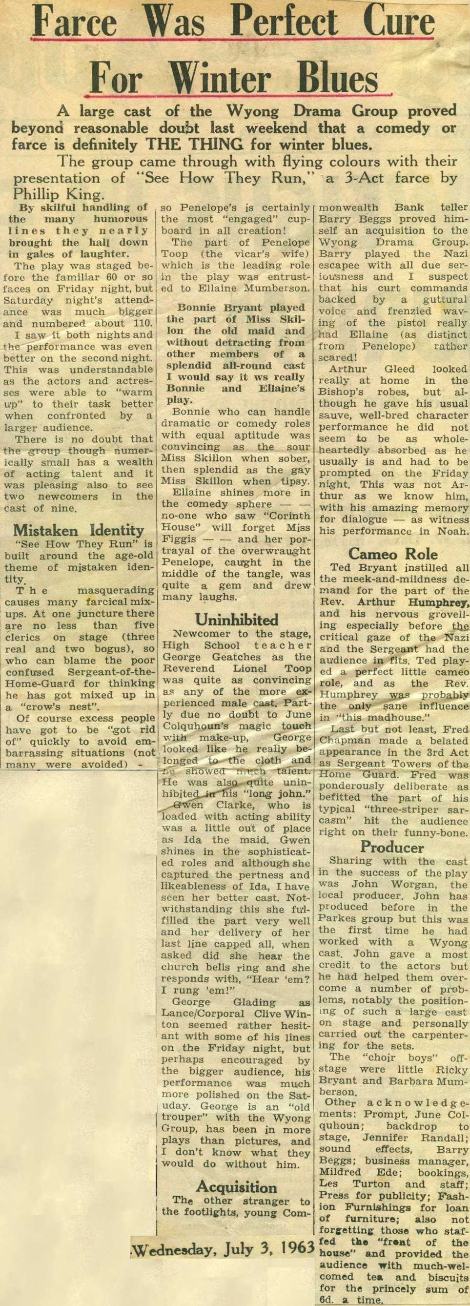 Review by "JW" in the Tuggerah Lakes News, Wednesday 3 July 1963.