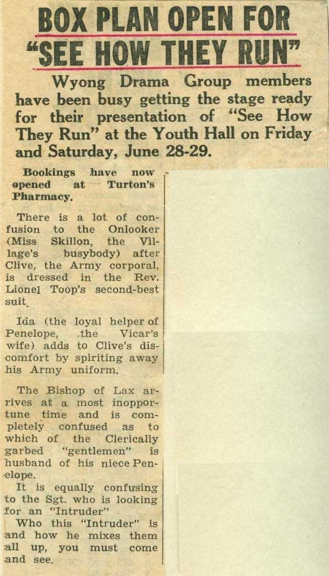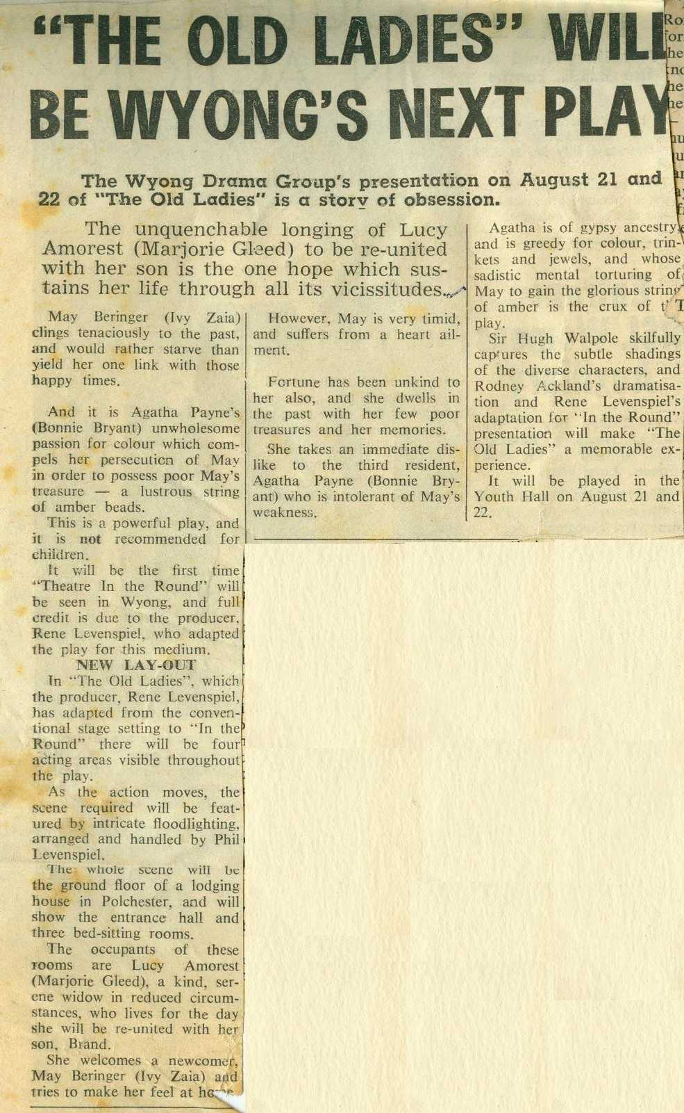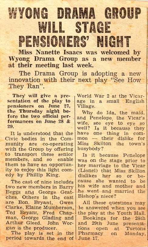 An announcement about a new member (Nanette Isaacs) who attended a meeting for the first time, and the introduction of a Thursday Night Pensioners' preview before the main Friday and Saturday performances. Note that nothing much has changed in that the paper got the title of the play slightly wrong.