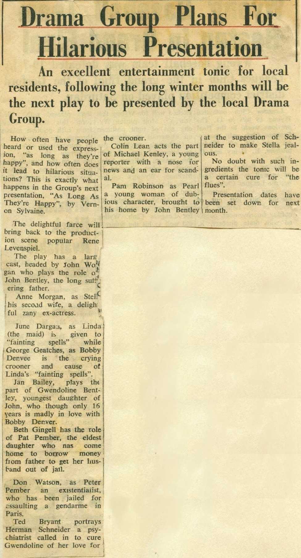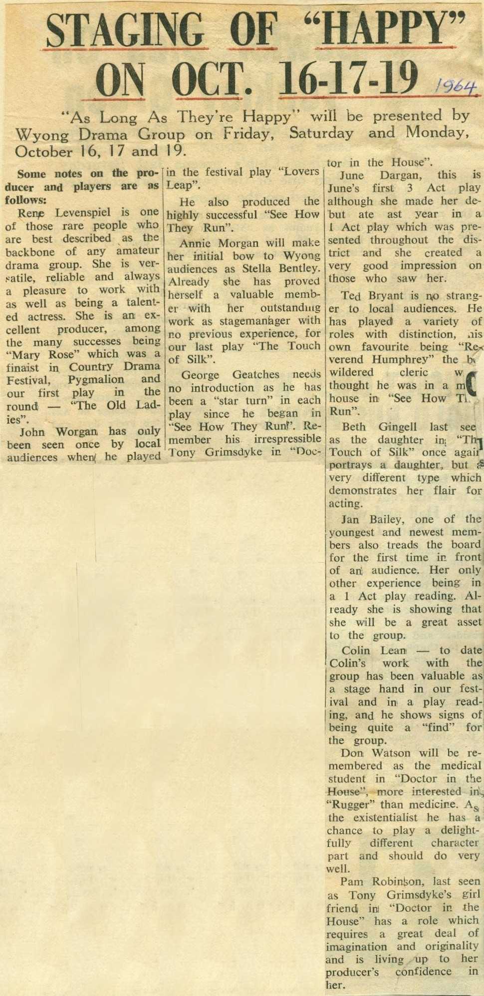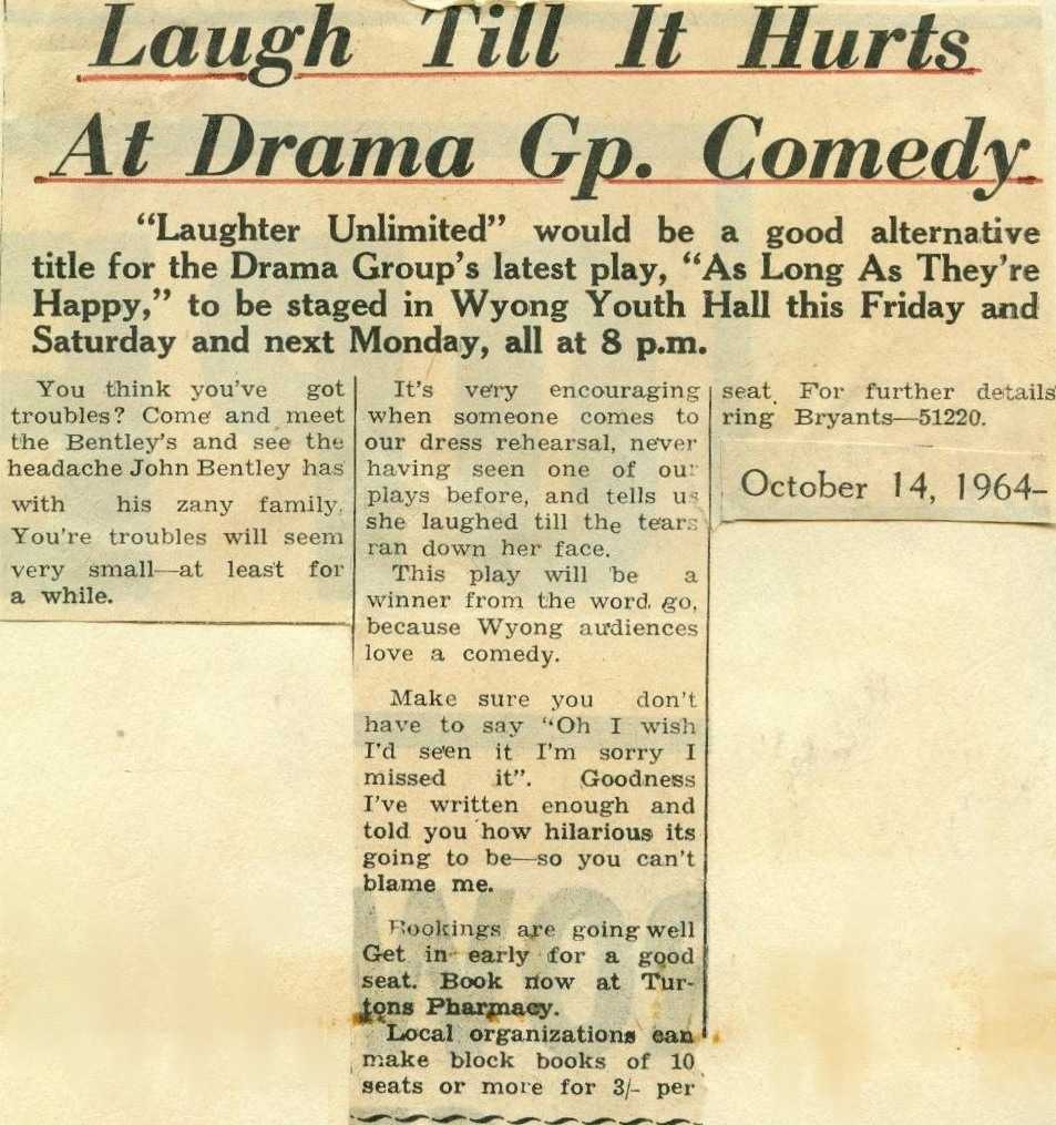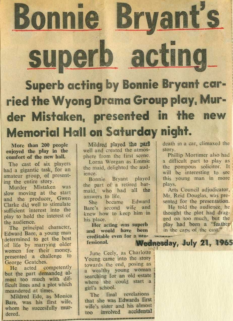 Neville Goldsworthy's article reviewing the play in the Wyong Advocate,Wednesday 21 July 1965