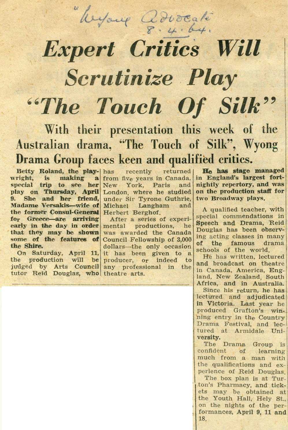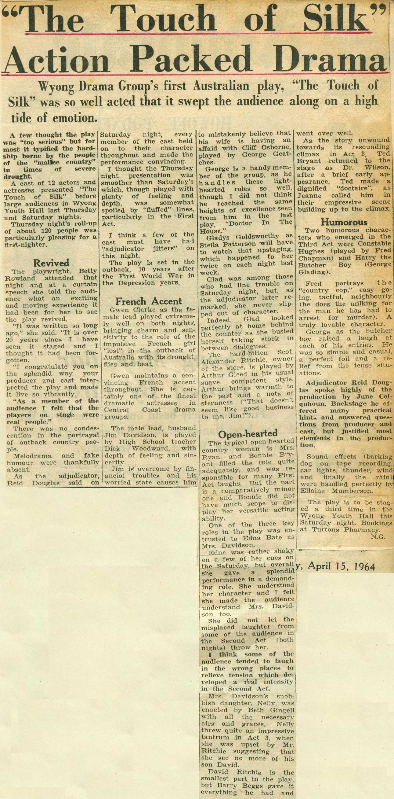 Review by Neville Goldsworthy: Wyong Advocate, Wednesday 15 April 1964